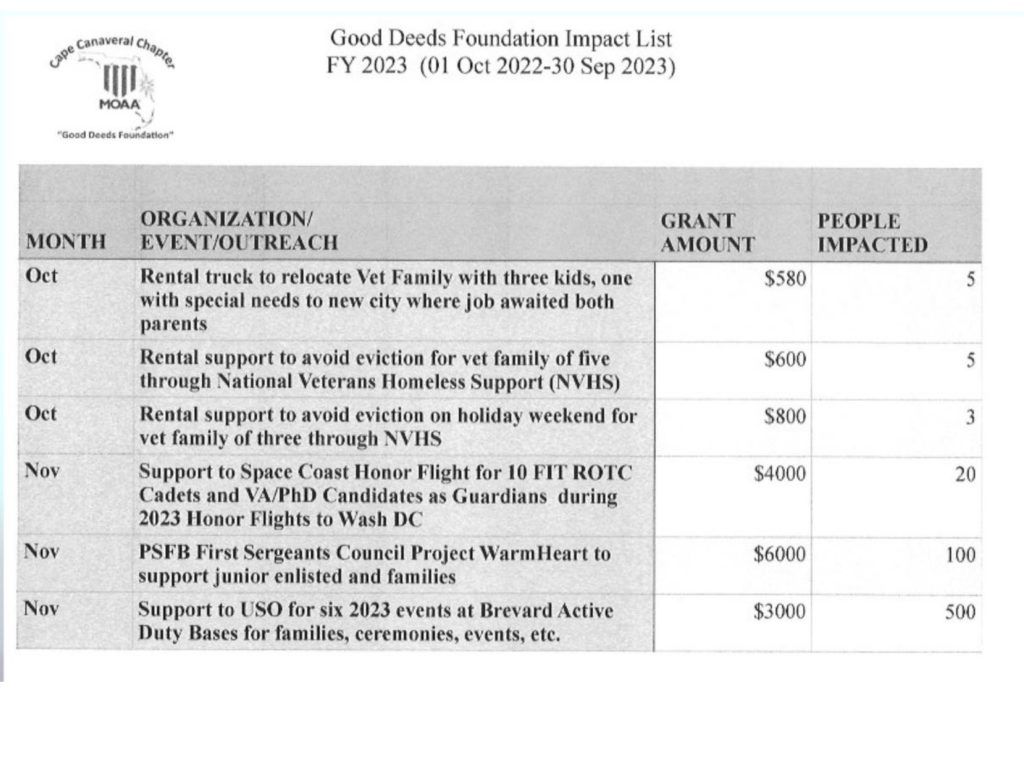 The MOAACC Good Deeds Foundation (GDF, TIN: 46-5148264), is a 501(c)(3) charitable organization supporting the aims of the Cape Canaveral Chapter of the Military Officers Association of America (MOAACC). It has provided direct support and grants to area military (primarily in enlisted ranks), veterans, and their families; ROTC, JROTC, Sea Cadet, Civil Air Patrol, and Young Marines; and other Veteran organizations and groups since 1987. In 2023, GDF provided grants totaling over $130,000 in support of these aims.