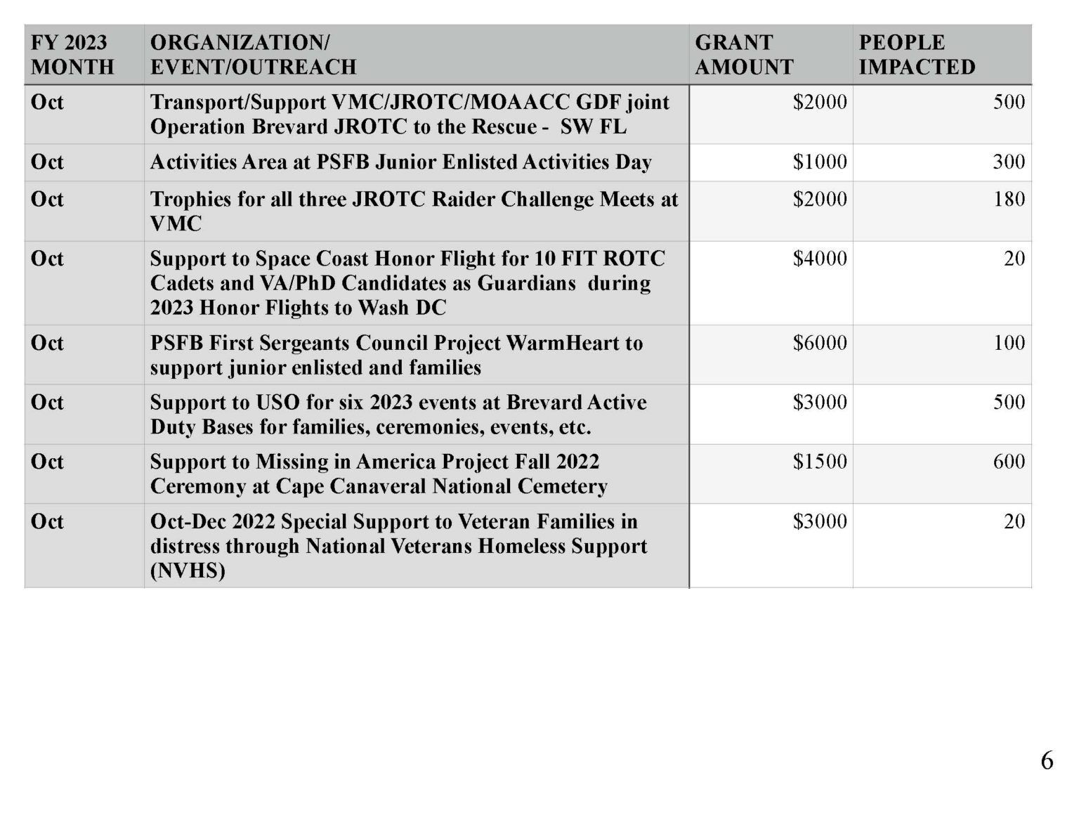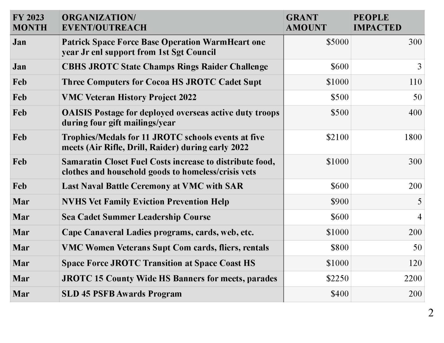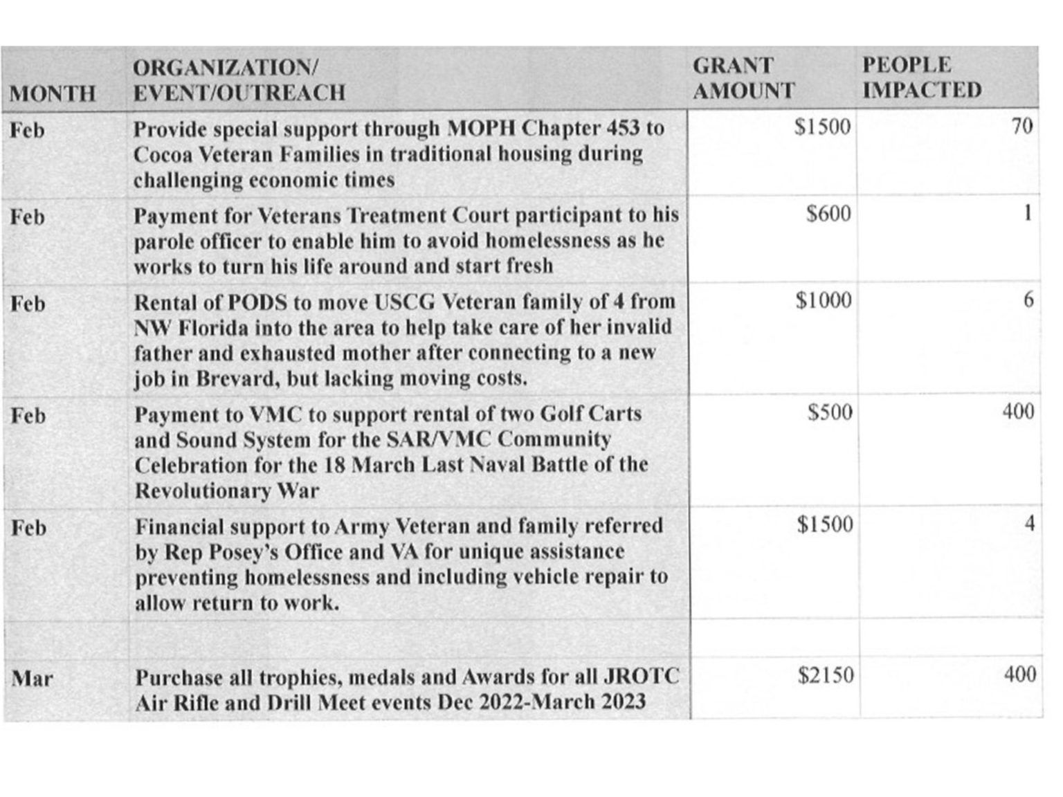 | Organization/Event Contributions Impact (# of People) Support Palm Bay JROTC Air Rifle Competition - 11 Schools, 18 Teams | $525 | 110 |