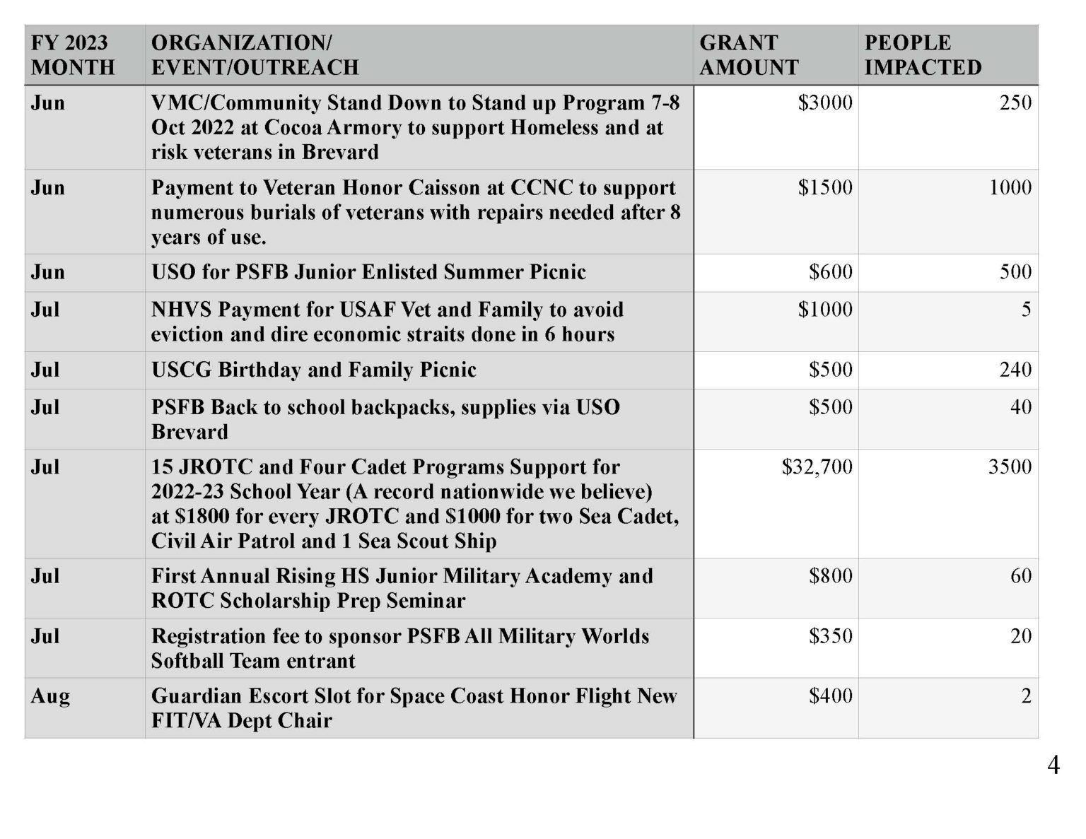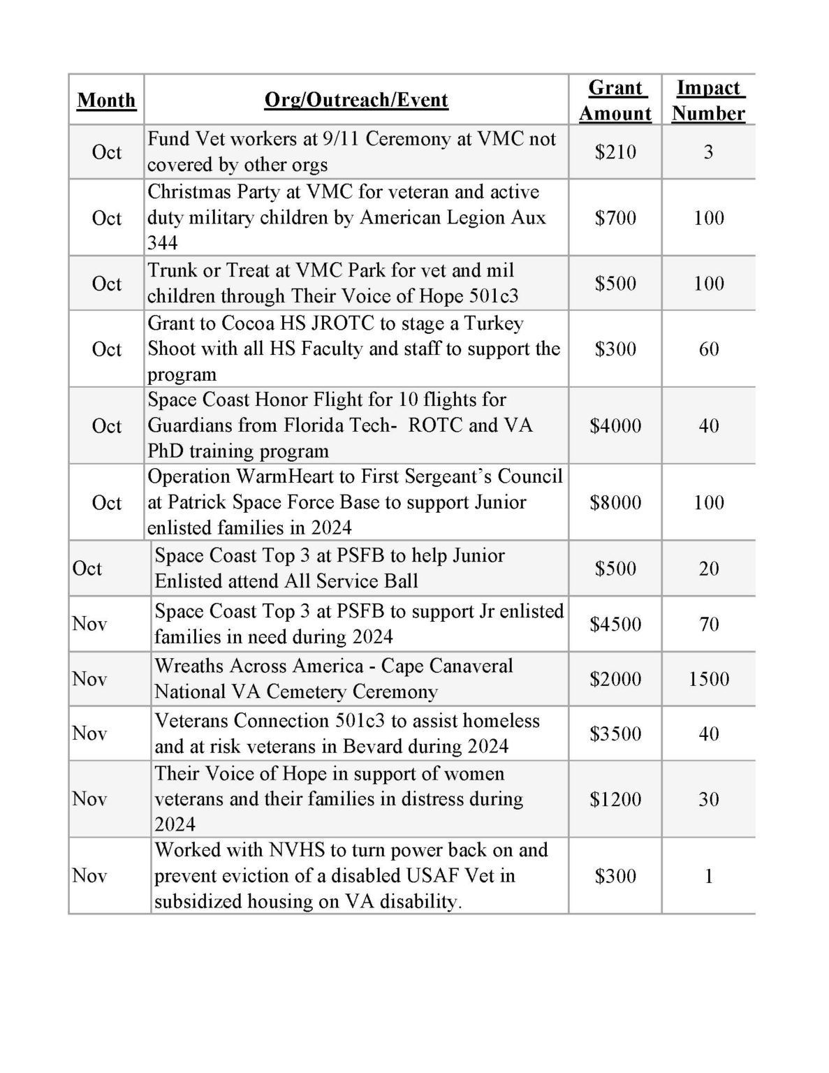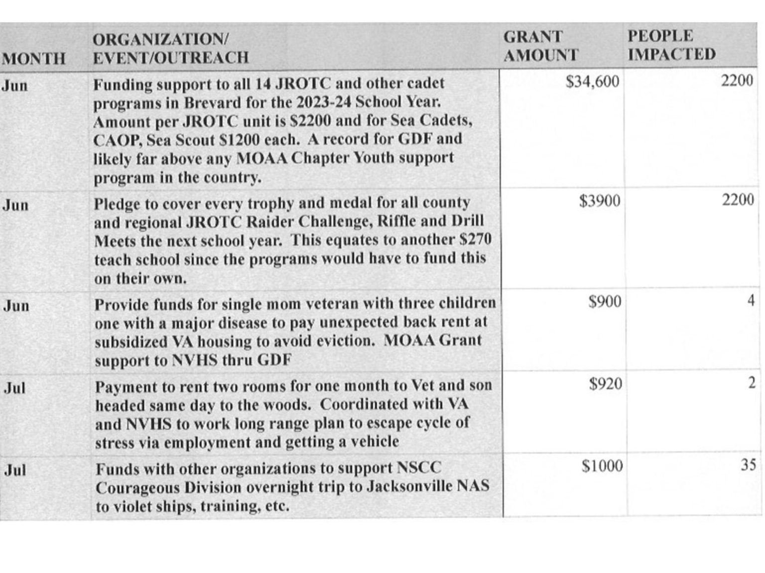| Organization/Event Contributions Impact (# of People) Support Palm Bay JROTC Air Rifle Competition - 11 Schools, 18 Teams | $525 | 110 |