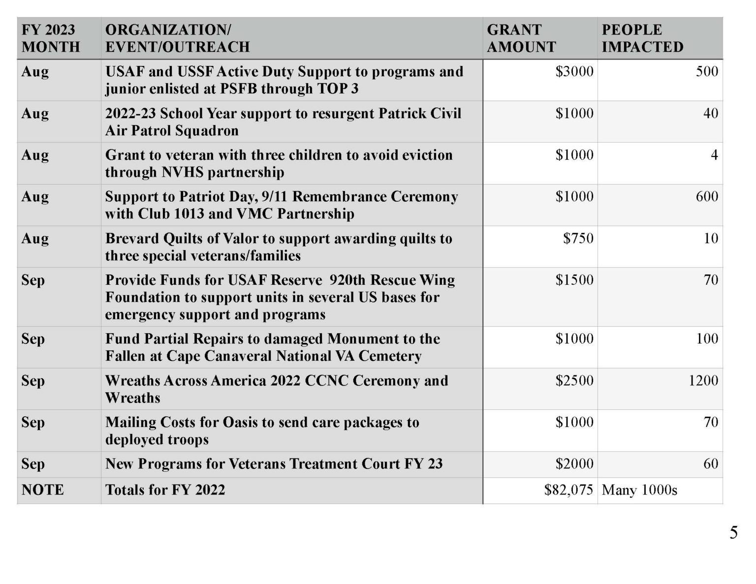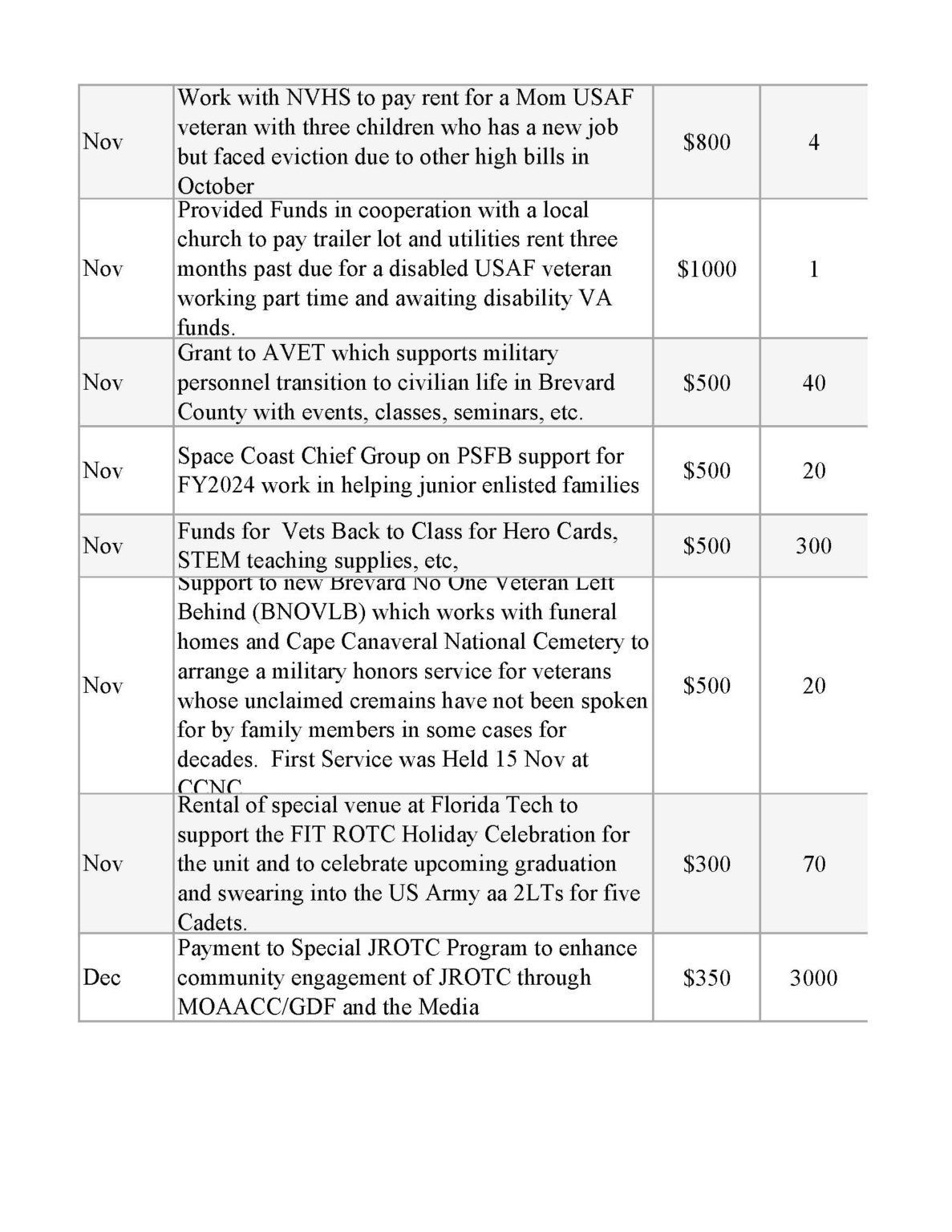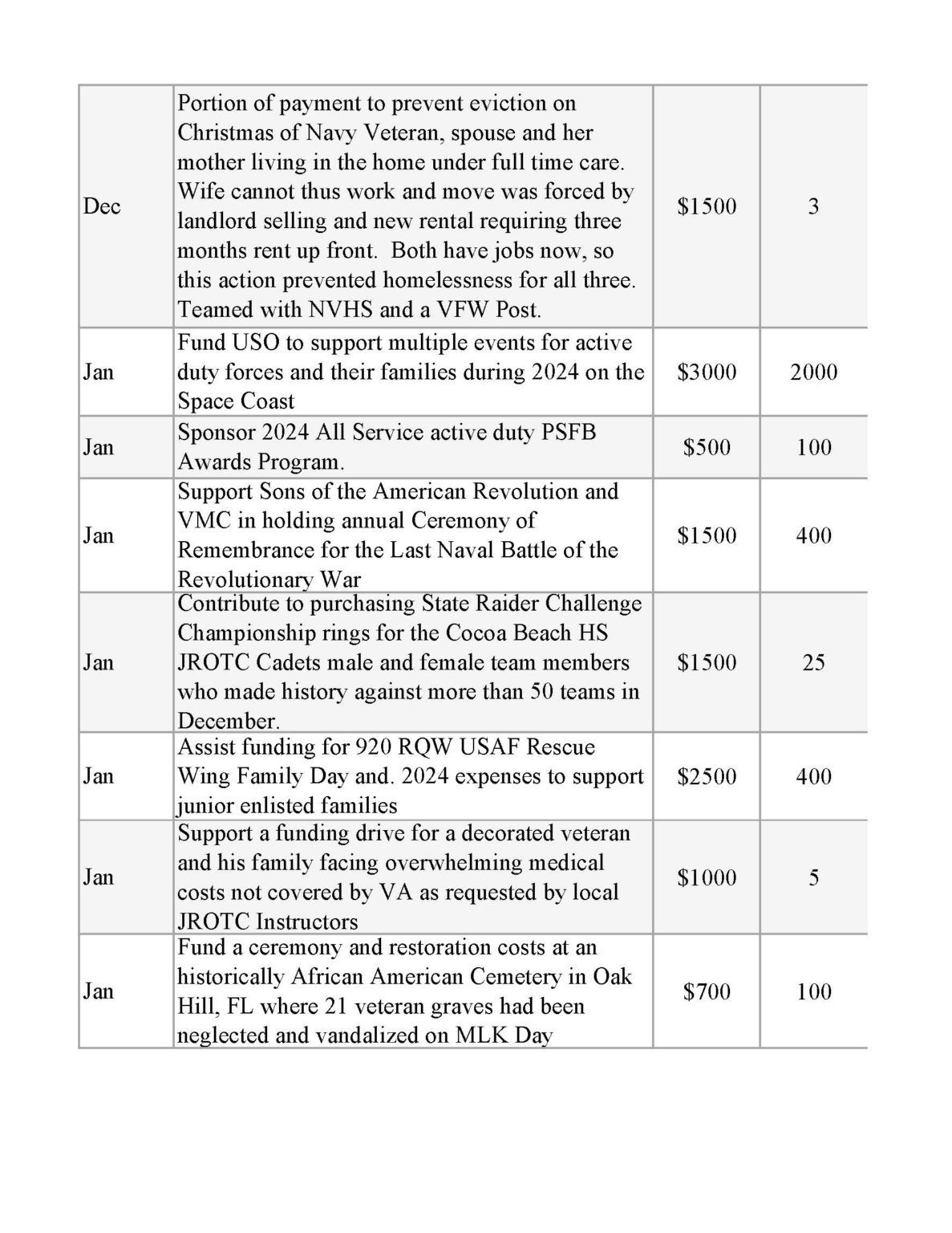 | Wreaths Across America for Cape Canaveral National Cemetery | $1,000 | 1,000 |