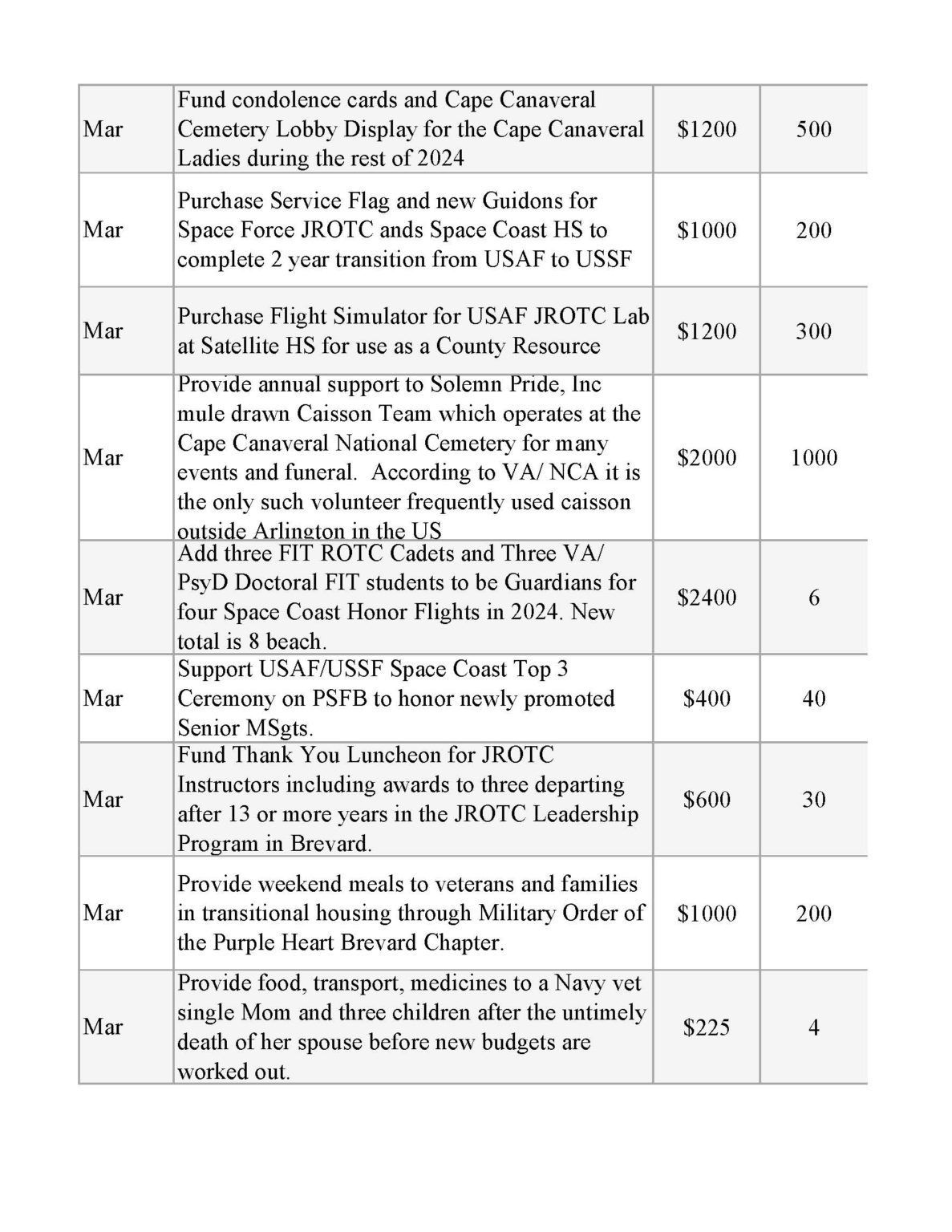 | Support Patrick Air Force Base Honor Guard | $250 | 100 |