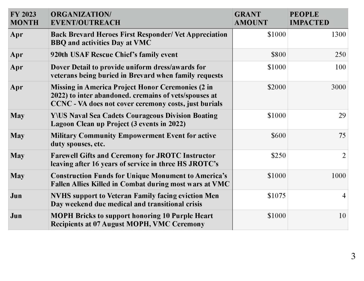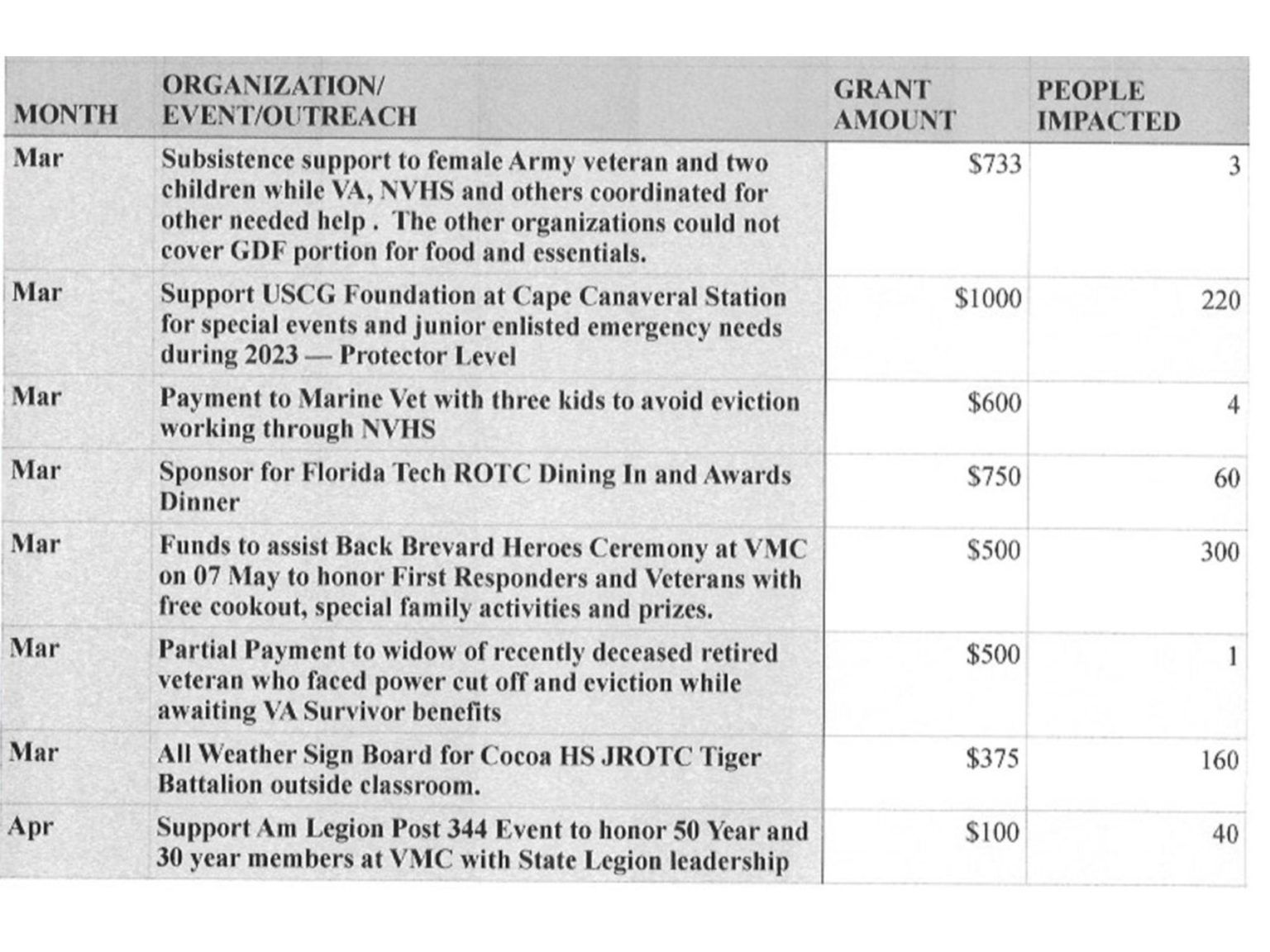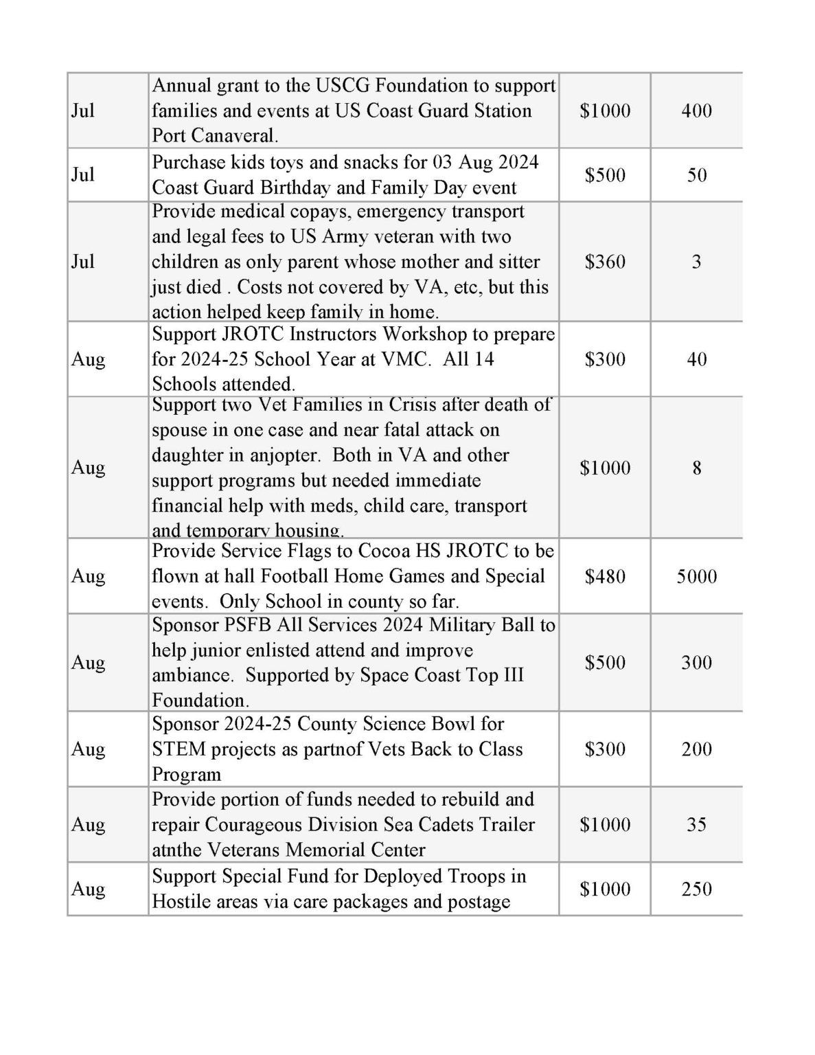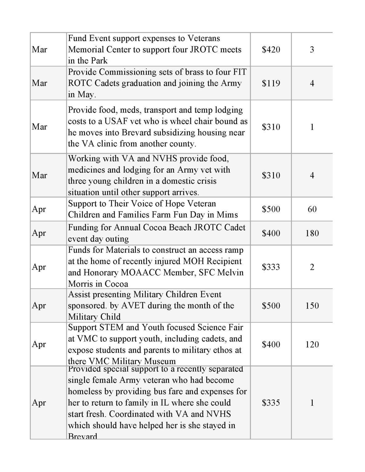 | Contribution to Brevard County Veteran’s Stand Down (Cancelled due to Coronavirus) | $2,000 | 250 |