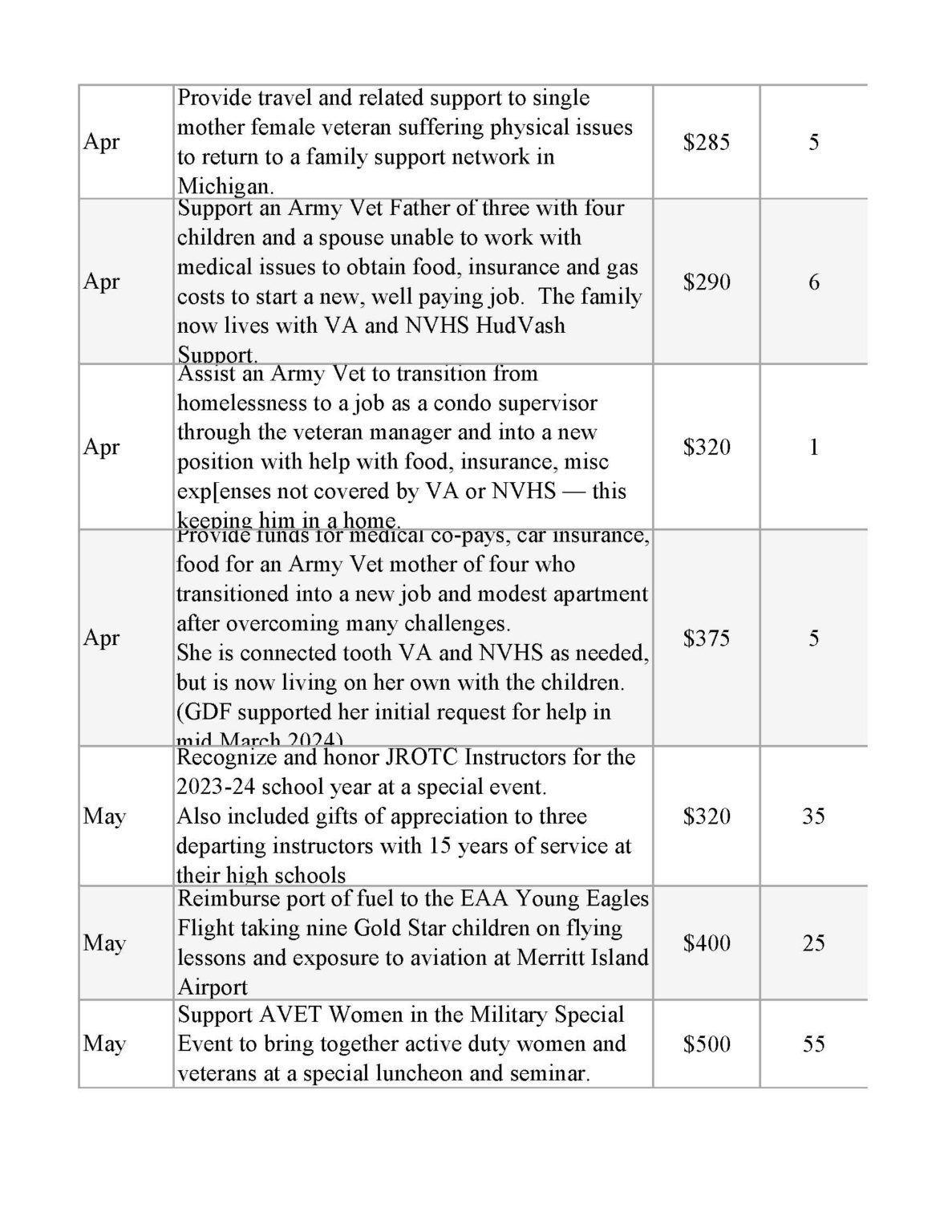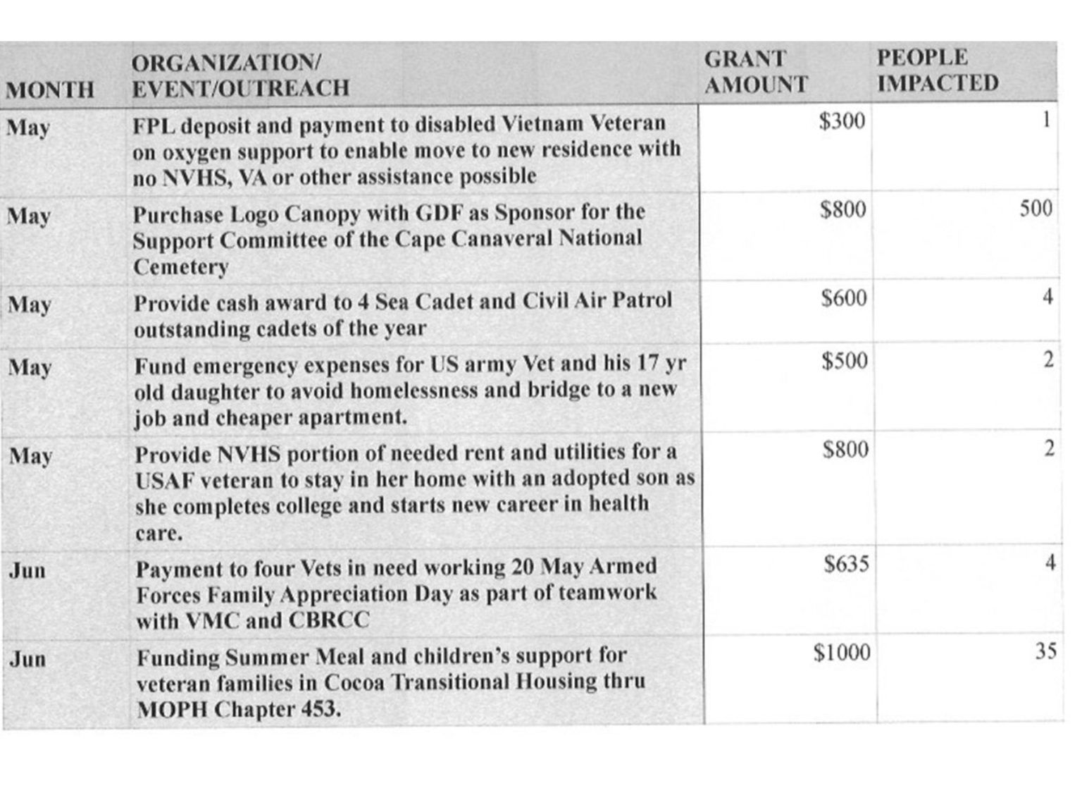 | Support of NVHS Veteran in Need | $1,500 | 6 |