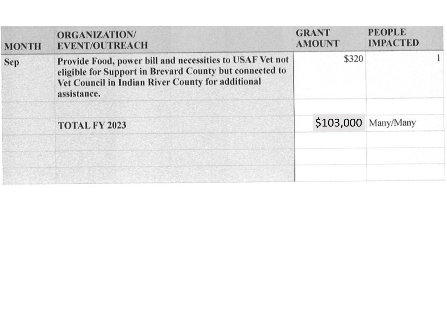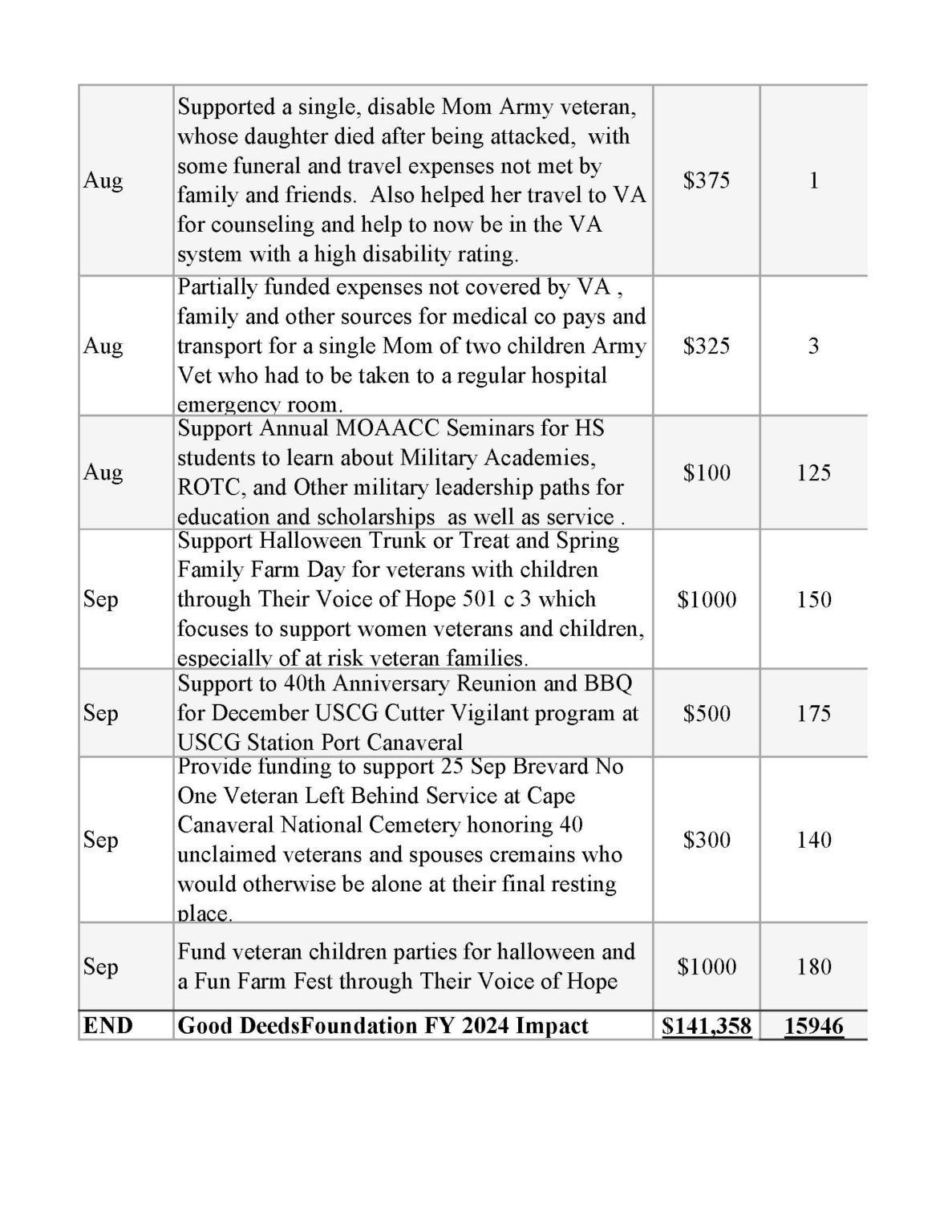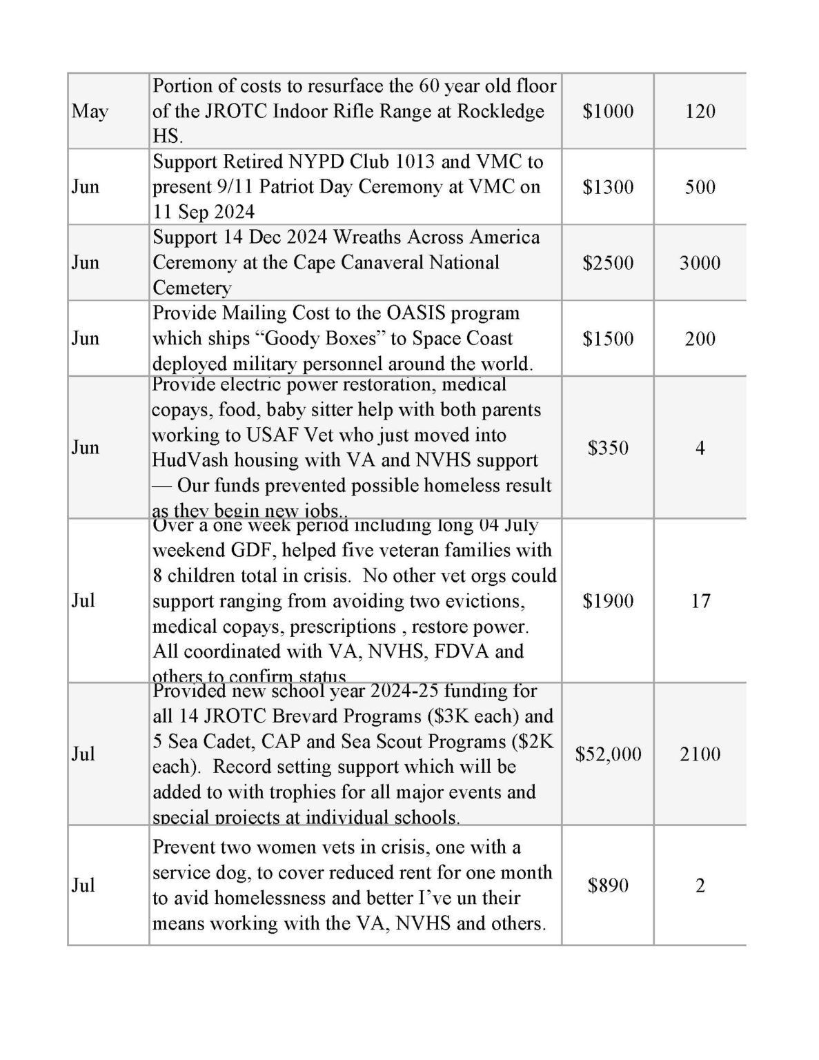 | Contribution to purchase POW/MIA flags for each Brevard County School | $500 | 75,000 |