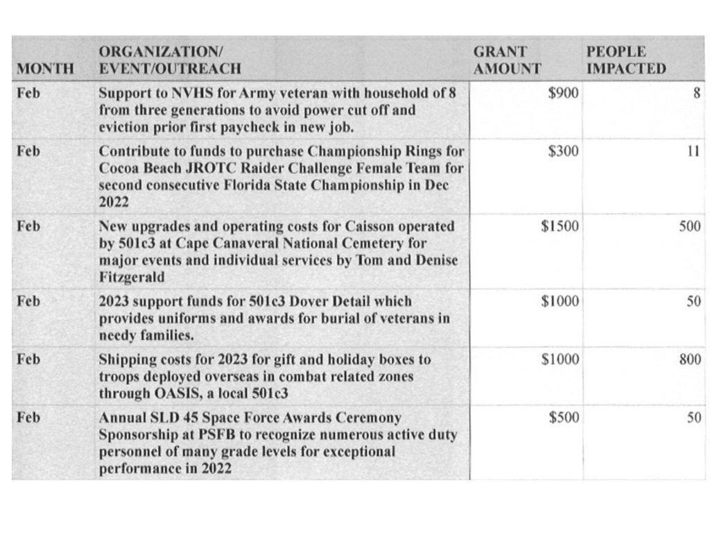 | Grant to 45th Space Wing First Sergeant’s Council for Operation WarmHeart for junior enlisted and family support | $5,000 | 100 |
