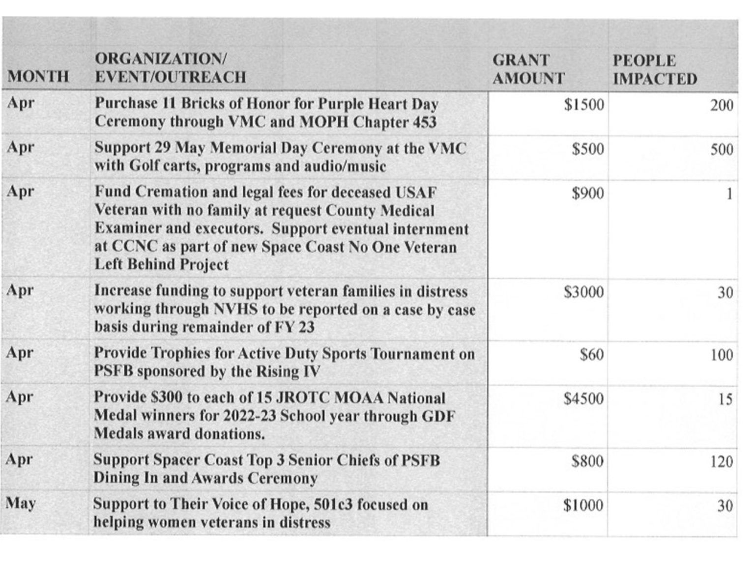 | Support to Memorial Day Ceremony at Shady Oaks Veteran Cemetery in Melbourne | $1,000 | 300 |